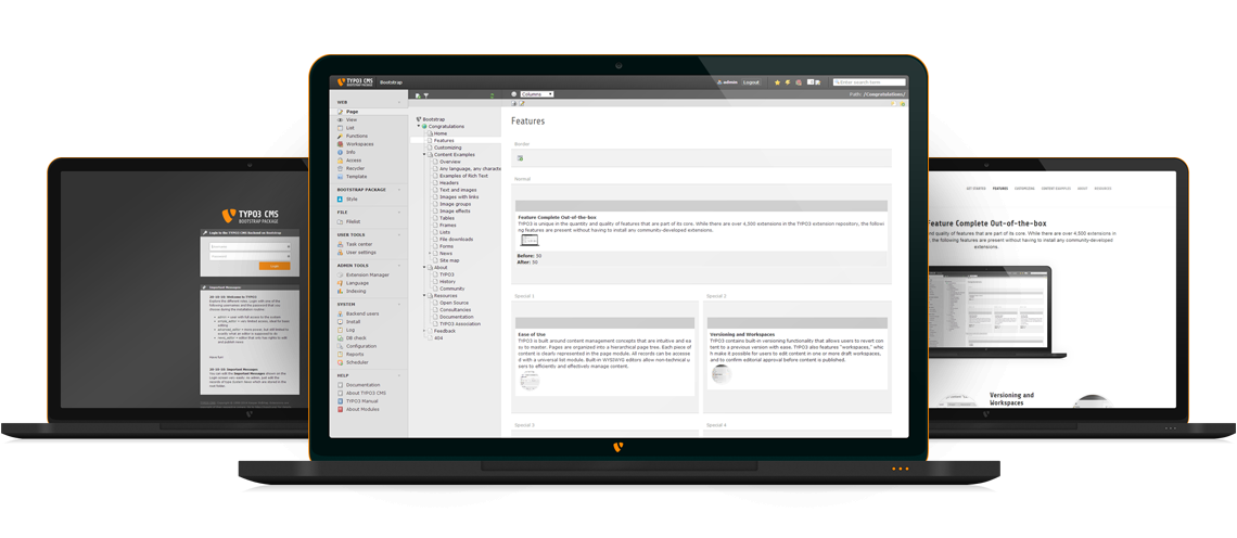 TYPO3 provides users with numerous possibilities for laying out images on a page. The back-end interface provides users with easy control over image formats, sizes, widths, groupings, and quality.